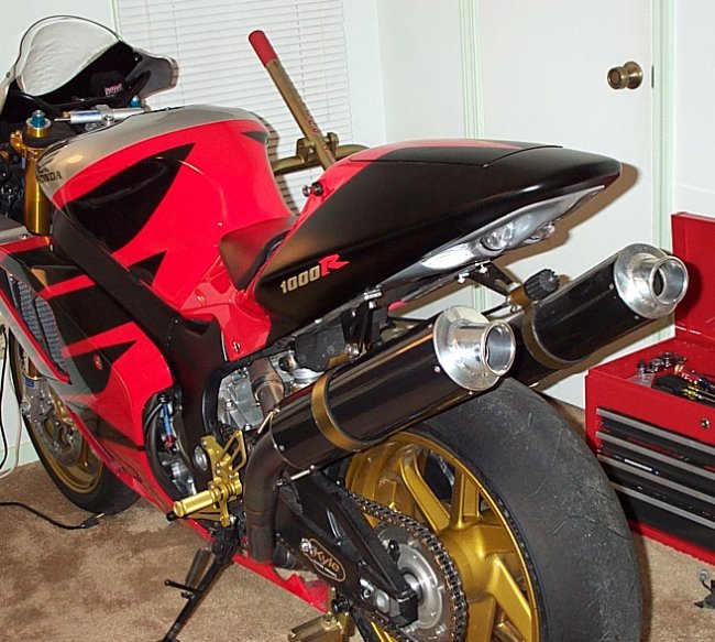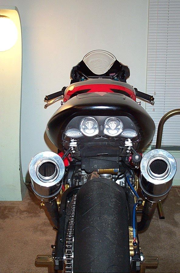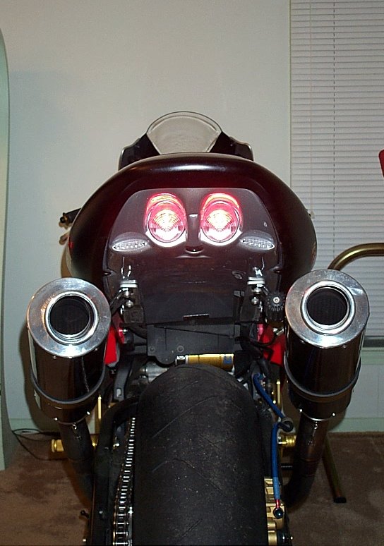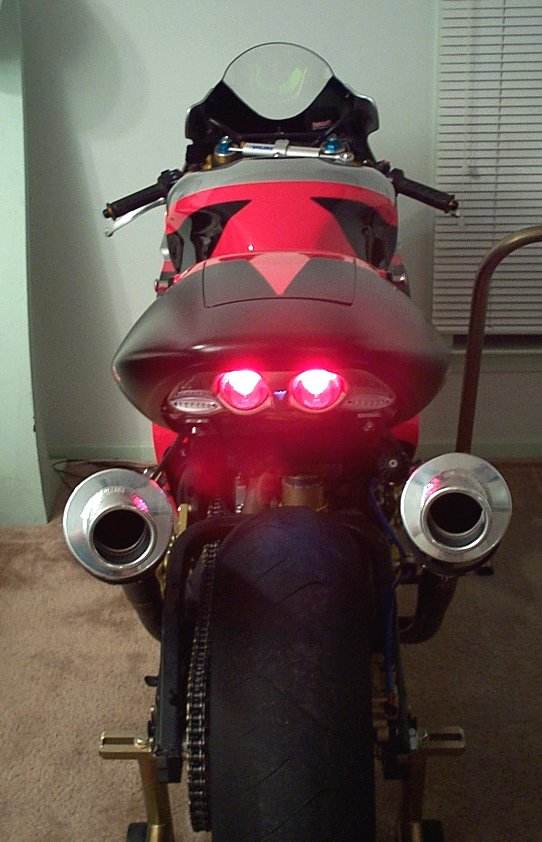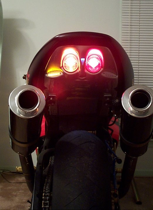 Dussault's prototype is the Shiznit! Like all the other undertray's I have seen it required some cutting of the stock undertray, but the end result is well worth it. It even works with the unconventional Sato exhaust hangers although it does rub the hanger right onto the undertail, but that is 100% preferable than having to cut on it to make it fit!. I've discussed this with Robert & he is going to look into a possible adhesive backed layer to put on the hanger rails to keep them from scuffing Not only are all the lights LED's but there is an additional amber LED inside the brake light that works in conjunction with the side turn signals! Robert did this intentionally to help insure that no matter what exhaust configuration you are running that your turn signals will be visible. The pics on my bike show the clear lenses, but the brake lights are also available in red & the turn signals are available in amber Cost will be $339 & they should be available about the 3rd week in December from |
