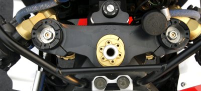 original RC51 Showa forks Ohlins never offered a 25mm cartridge kit for the RC51 because the RC51 was never raced in Supersport or Superstock trim only Superbike which replaces the forks entirely rather than just the internals. The 30mm NIX cartridge kit is the most current Ohlins R&T front suspension option. It is a drop in cartridge kit for OEM forks on current sportbikes. This kit replaces all of the internals on the OEM RC51 Showa forks. It uses 30mm Ohlins valving in place of the original 20mm Showa valves. Compression damping is found on the left fork leg while the right leg controls rebound damping. The main advantage of this setup is the ease of and speed in which spring changes can be made as well as other internal suspension tuning. Spring changes literally take minutes and can be done while the forks are still installed on the bike which is very valuable in a racing environment. The compression adjusters on the bottom of the RC51 fork leg remain but are no longer used. Technically, Ohlins does not make this kit specifically for the RC51 as they don't normally provide new product for older bike platforms. However, Kyle USA has developed a custom kit that retrofits the Ohlins 30mm NIX cartridge kits into the OEM RC51 Showa forks. In order to retrofit the kit, custom extended fork caps are made by Kyle USA and used. That is why you see large black caps on the forks in pictures of this kit for the RC51. The Ohlins 30mm NIX cartridge front suspension kit is generally considered to be the best option for people who want the ultimate performance, which is often on the track and in racing. Their performance in a racing environment is without a doubt a higher spec than than the upgraded Ohlins FG832 and 322 forks. The aesthetics however of the 30mm NIX upgrade are not as appealing to most people compared to the gold bling of the Ohlins Road & Track forks. |
